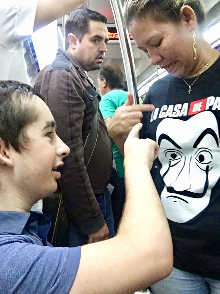 Nina is our ‘Subway Seat Finder’. He figured out that as soon as he gets on a subway, someone gets up for him to give him a seat (consistently kind collective behavior). It didn’t take long for Nina to get use to this perk so every time he would get in a subway, he would run over to the seats and say ‘I need to sit down’ looking at whoever was going to give up their seat first. One time, some nice lady got up to offer him her seat but a minute later, I realized that Nina was talking to her and pointing to her breasts. I then heard him spelling out three words on her shirt, letter by letter, all the while he was pressing on each letter (right on her boobs). The woman did not speak English and my Spanish is terrible, definitely not good enough to appropriately apologize for Nina. I tried to stop him from continuing to spell, letter by letter, but with no luck. He insisted on talking with her, pushing on her breasts (letters) and repeating loudly every letter. She was super kind, really funny, she was telling him in Spanish what the words mean, he was telling her in English his translation. They were talking!!! The woman was not bothered one bit by Nina even though his teenage sister, once again, almost died of embarrassment.