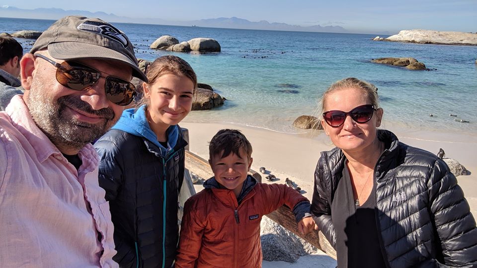 One evening, on our way back to our apartment, we were passing by a skateboard park and Maksim and I decided to stop by to see it. As we were standing there observing the skateboarders, we started a conversation with a couple watching their two sons skate. It turned out we hit it off immediately and before we knew it, Maksim was skateboarding with the boys and we were making plans to have dinner together that same night. Our new friends, Tina and Jacques, took us out for dinner to a fancy restaurant when it was confirmed that we were just meant to meet. I feel like we have met friends for life. Our boys were instant friends and my connection with Tina felt like we have known each other form previous lives. We ended up visiting them again the next day for a day on a beach in their hometown near Cape Town where we met some of their friends too. We also had another dinner together on our last night in Cape Town. Jacques, an avid surfer, inspired us to take family surf lessons in Muizenburg, the main surfing town near Cape Town. We arrived to Muizenburg dressed in winter gear (puff jackets, hats, etc.) and then entered the cold ocean for a couple of hours of fun surfing and swimming. We’ve concluded that surfing is fun but skiing is better. Meeting Tina and Jacque and their two boys has been a highlight of our time in South Africa. I’m certain we’ll cross paths again one day.