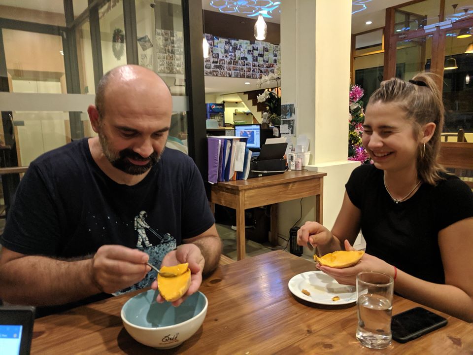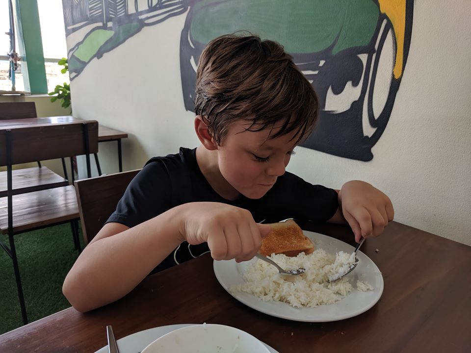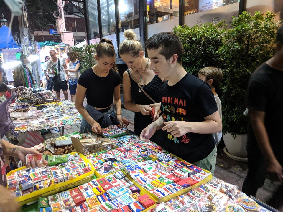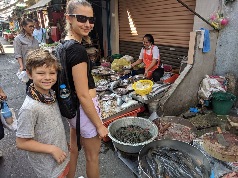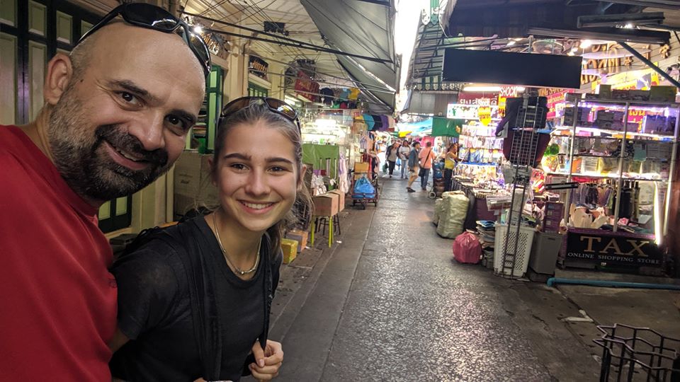 We stayed in a hostel in the old part of the town, close to the well-known Khaosan Road. Our room was big enough for 3 bunk beds plus a bathroom. It gets crowded in such accommodations, especially when the length of stay is longer than 2-3 days. We were there for 8 nights. Kids did a ton of schoolwork in the lobby, especially Maki who was doing a lot of writing there and practiced typing daily. Right after we arrived, Nina fixated on some green shirt with flags that they were selling in the lobby of our hostel. He insisted we buy it for him. It was only $3 so I was not against getting it even if just for a few wears but it was so darn ugly. He loved it though, really loved it. He was sold on flags and names of the countries on this darn shirt. Eventually, we got it for him and he was happy wearing it for days. Now he will not let me get rid of it. Learning – can’t get a new piece of clothing without getting rid of something you already have.