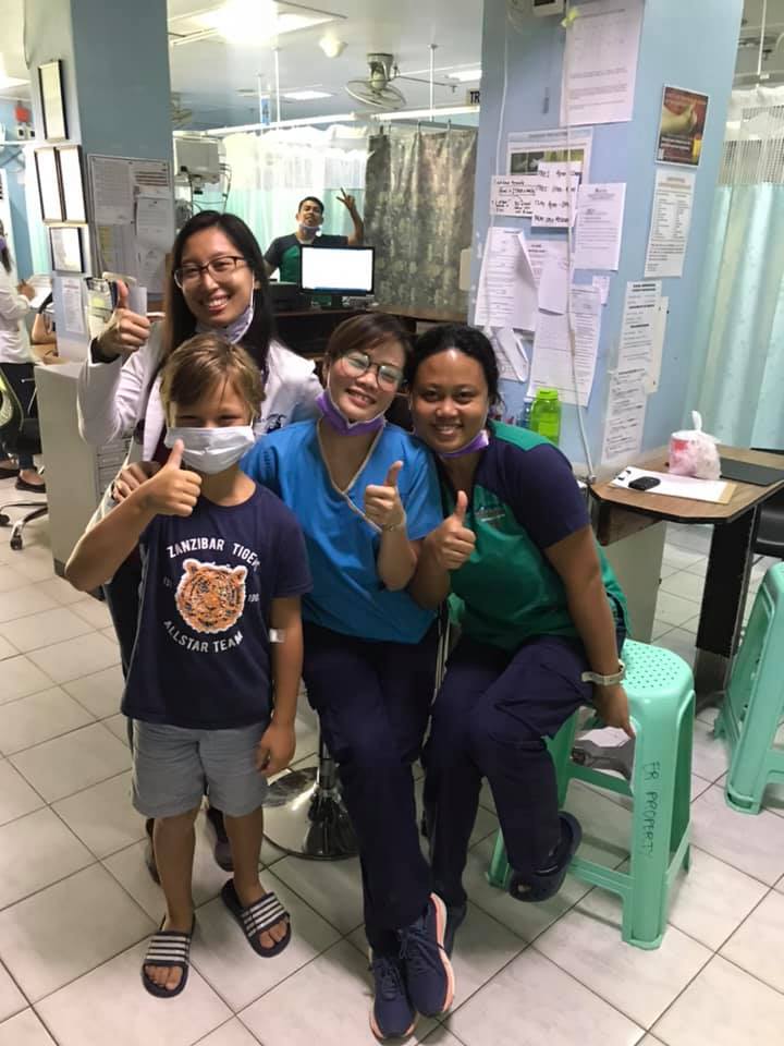 As we were getting ready to leave the island of Palawan, he came out of the shower this morning, complaining of terrible stomach pain. Then he laid down a bit and the pain just got worse, he couldn’t straighten up much. I got worried that we were about to get on an airplane and travel for 15 hours and he didn’t look well.