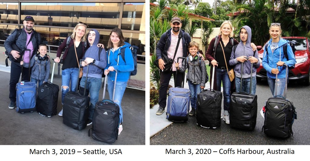 Today is exactly 1 year (+1 extra day for leap year) since we started this Refresh Journey. This morning, we were moving from Coffs Harbour to Gold Coast, Australia and I enticed everyone to recreate the first photo we took when we were ready to leave Seattle.